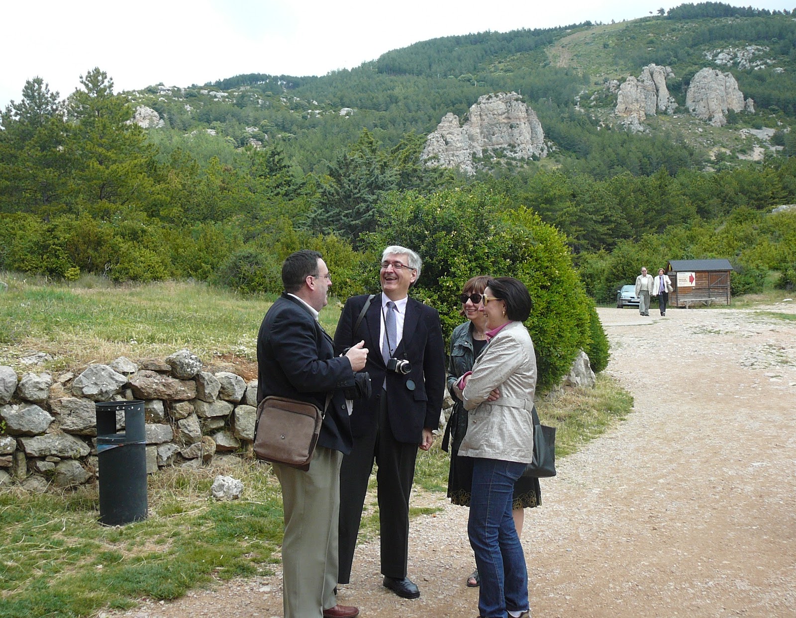 En la foto aparecen antes de entregarle la placa conmemorativa y la maqueta del castillo, el Socio de Honor y pintor Adolfo Lahoza, Santiago Gállego, de la Junta Directiva, José Luis Aramendia, romanista y Socio de Honor y Domingo Buesa, catedrático de Historia y también experto en arte románico. Y a la derecha, José Antonio Santolaria, socio fundador de la Asociación y miembro de la Junta Directiva.