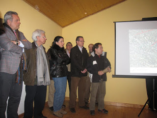 Las actuaciones de Gallocanta se enmarcan en el Proyecto LIFE Naturaleza Adecuación de tendidos eléctricos en las Zonas de Especial Protección para las Aves de Aragón , desarrollado desde el Departamento de Medio Ambiente en colaboración con ENDESA Distribución y Red Eléctrica de España, que ha sido seleccionado entre los 20 mejores proyectos LIFE de Naturaleza de Europa. Se trata de un reconocimiento que concede la Unión Europea, entre los cerca de 80 proyectos LIFE concluidos y evaluados en 2009. En el marco de este proyecto se ha actuado en un total de 325 Km de tendido, en concreto se han acondicionado 61 instalaciones de 18 Zonas de Especial Protección para las Aves de las tres provincias aragonesas.En la imagen, momento de la presentación de las actuaciones en el Centro de Interpretación de La Laguna de Gallocanta. El jefe de servicio de Biodiversidad, Manolo Alcántara, explica el proyecto ante el consejero, Alfredo Boné (primero por la izquierda); el director general de Endesa en Aragón, Jaime Gros, y la directora general Anabel Lasheras
